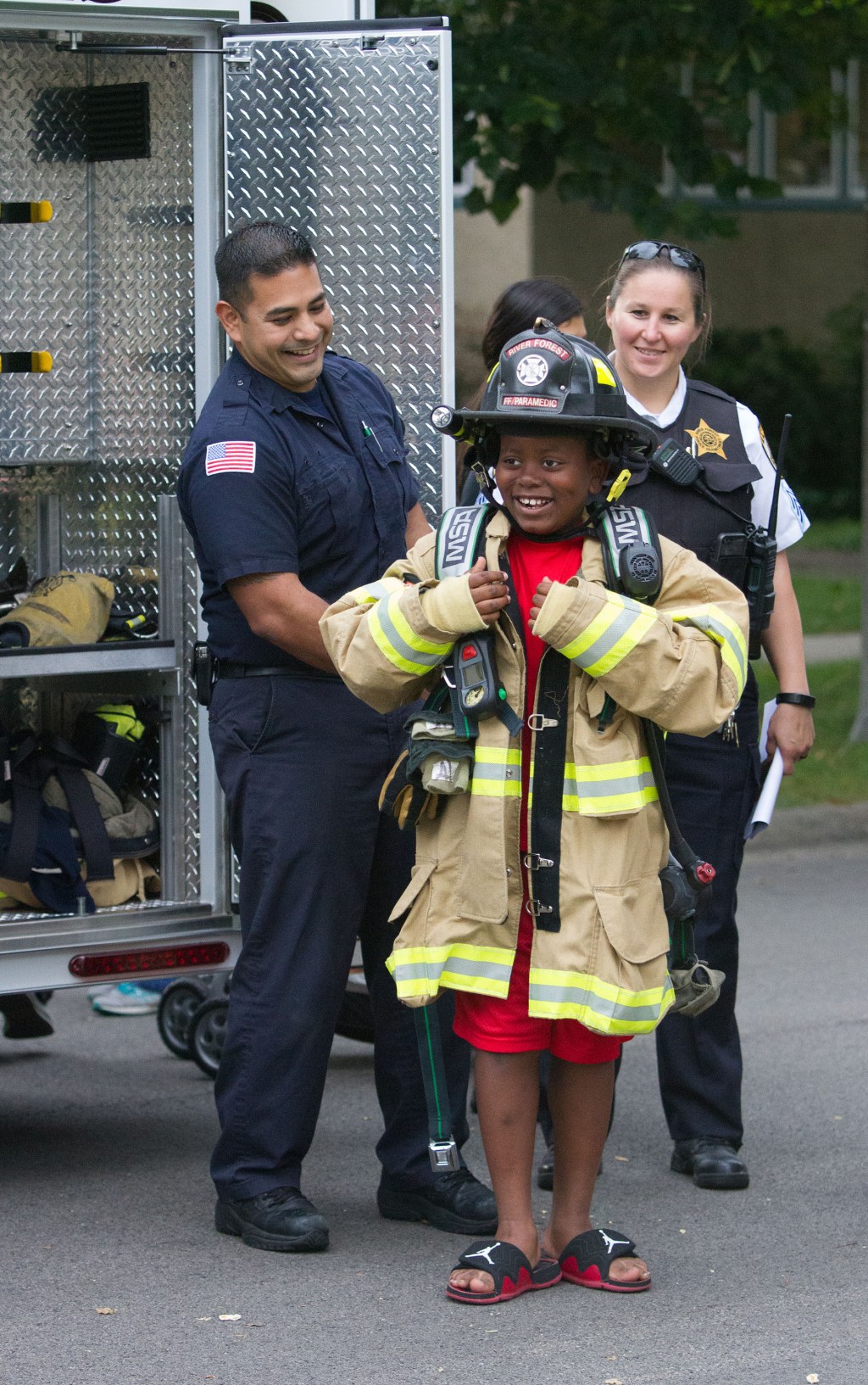 Featured photo: James Harmon tries on firefighting gear with the assistance of River Forest firefighter Adan Viera as River Forest police Sgt. Edith Buckner looks on.