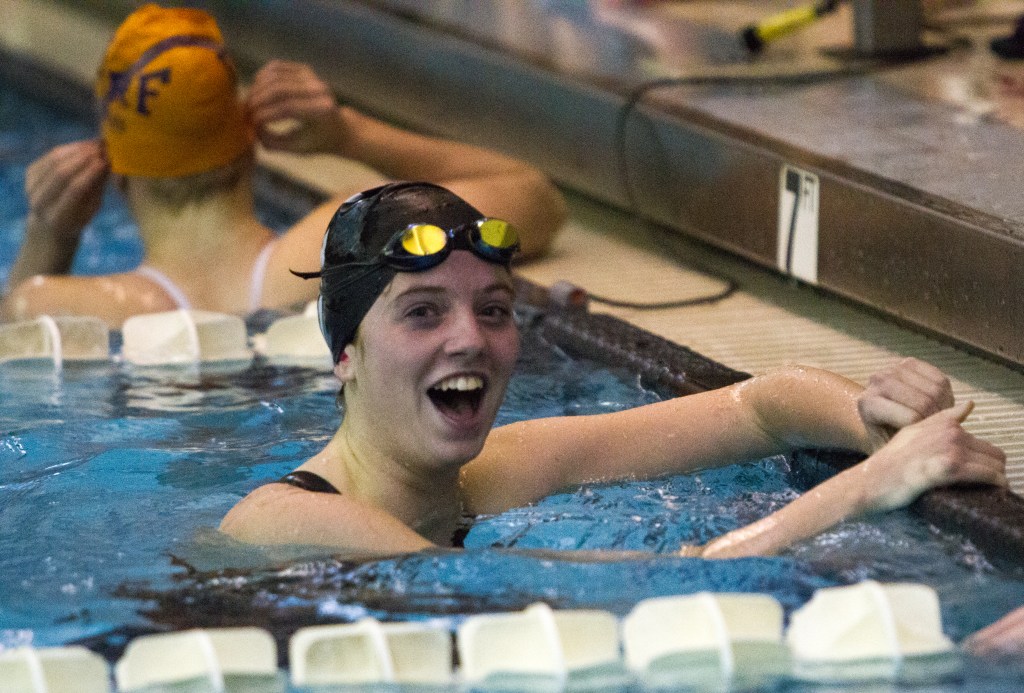 Featured photo: Fenwick senior Theresa Mullen smiles at her relay team’s finish time for the 400-yard freestyle relay at the IHSA Girls Sectional on Saturday, Nov. 14, 2015
