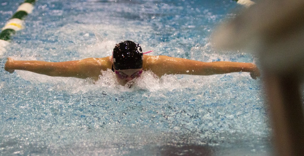 OPRF senior Genevieve Curry races against time in the girls 200-yard medley relay at the 2015 IHSA State Swimming & Diving Championship on Saturday, Nov. 21, 2015